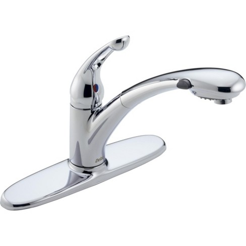 The classic single handle kitchen faucet with spray from delta faucet s collection of kitchen products offers the great looks and quality engineering that fit your lifestyle.